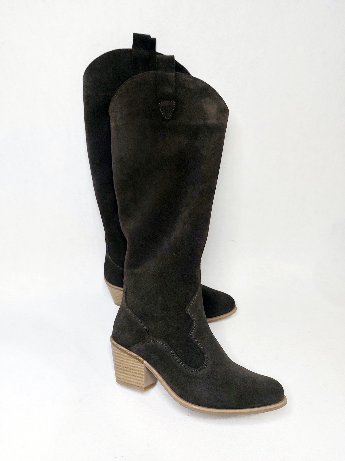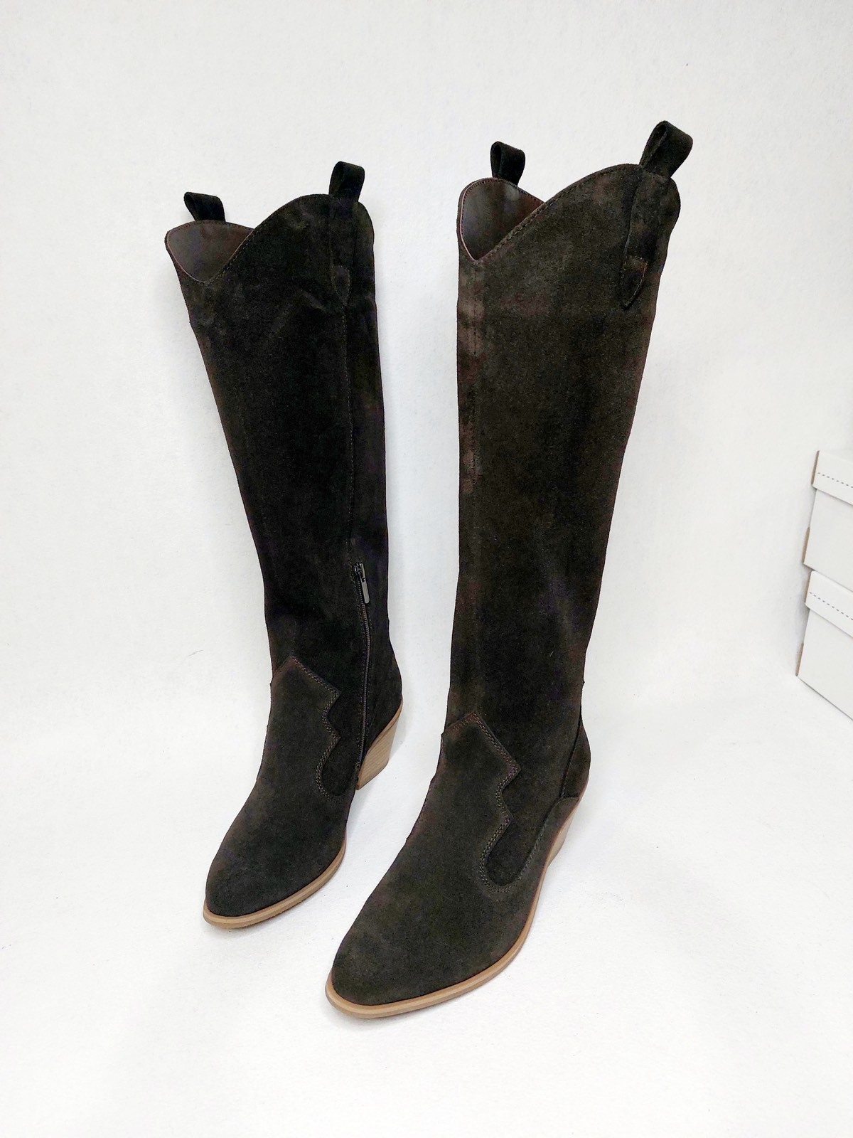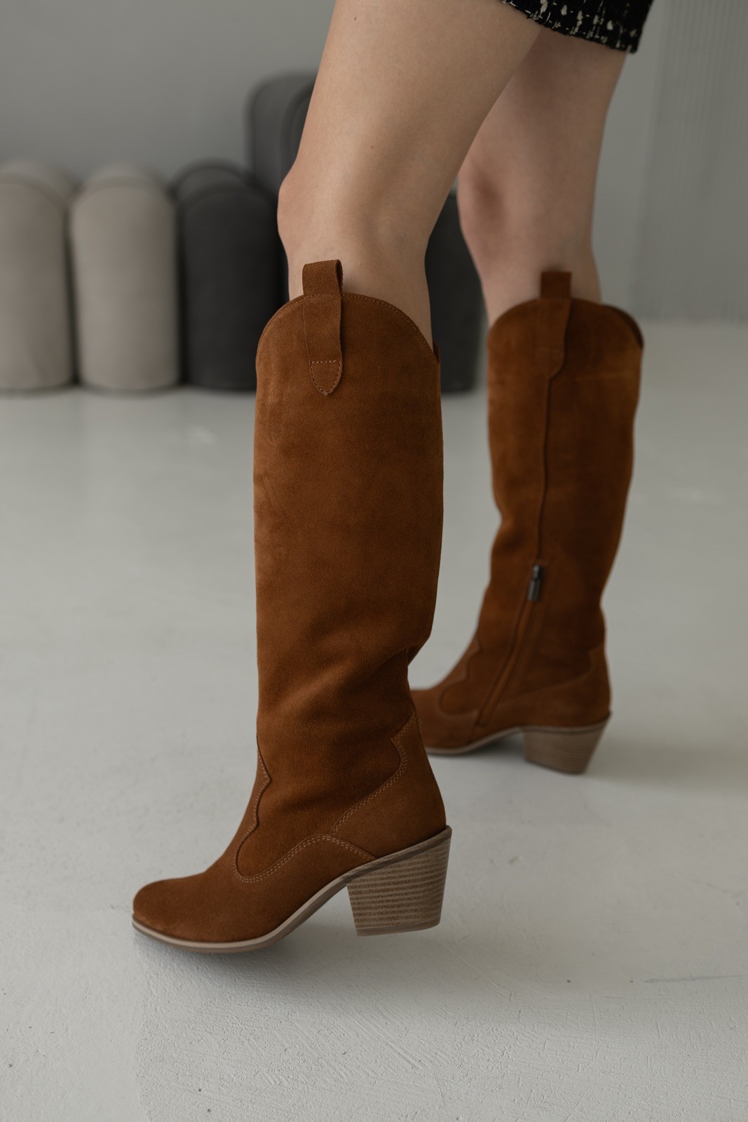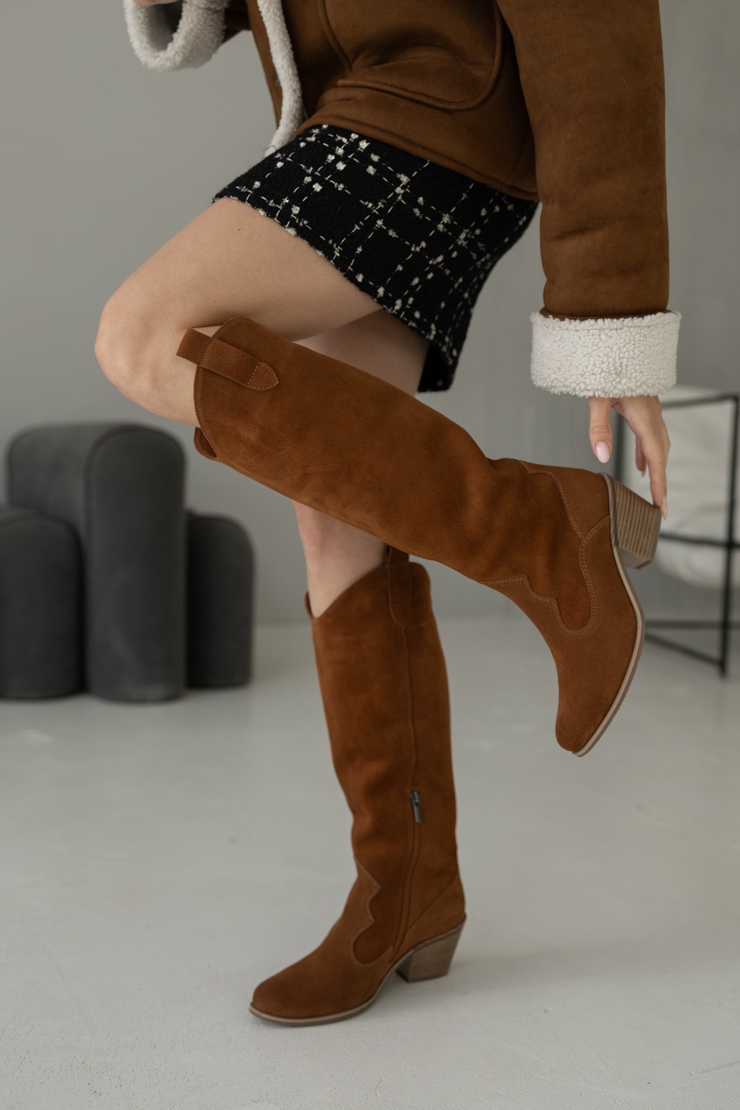 МАТЕРІАЛ: натуральна замша, є можливість виготовити в інших кольорах, або в гладкій шкірі, звертайтесь до менеджера. Стійки підбори висотою 5 см. Висота черевика без підошви 40 см