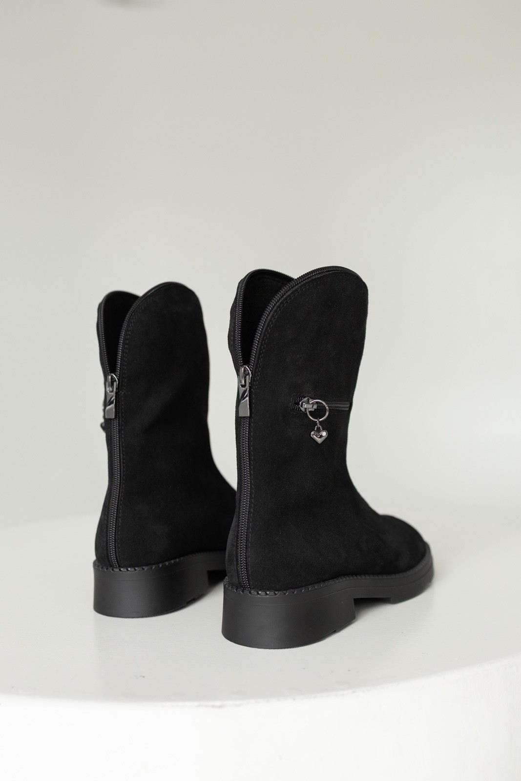 Базові чоботи, на кожен день. Відповідають всім вимогам для взуття, яке стане Вашим супутником кожного дня, а саме: анатомічна форма носка, натуральна, м'яка дихаюча замша. Легенькі, колодка комфортна. Підошва гнучка, невагома і зручна. Зручна застібка змійка попереду чобітків, дозволяє швидко вдягатись і регулювати обхват по ікрі.